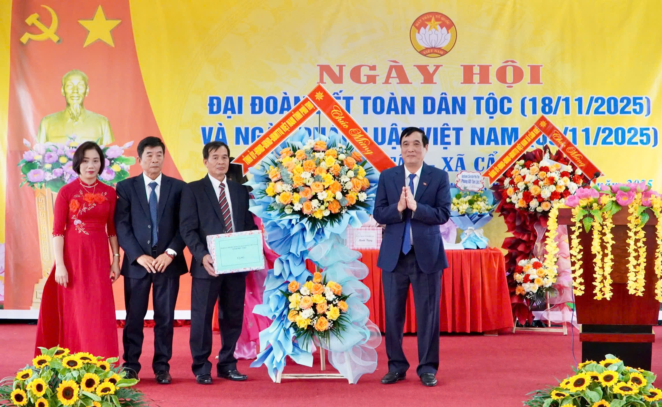 Phó Chủ tịch Ủy ban MTTQ tỉnh, Chủ tịch Hội Nông dân tỉnh Hoàng Xuân Giao và các đại biểu tặng hoa, quà chúc mừng Nhân dân khu 11, xã Phù Ninh